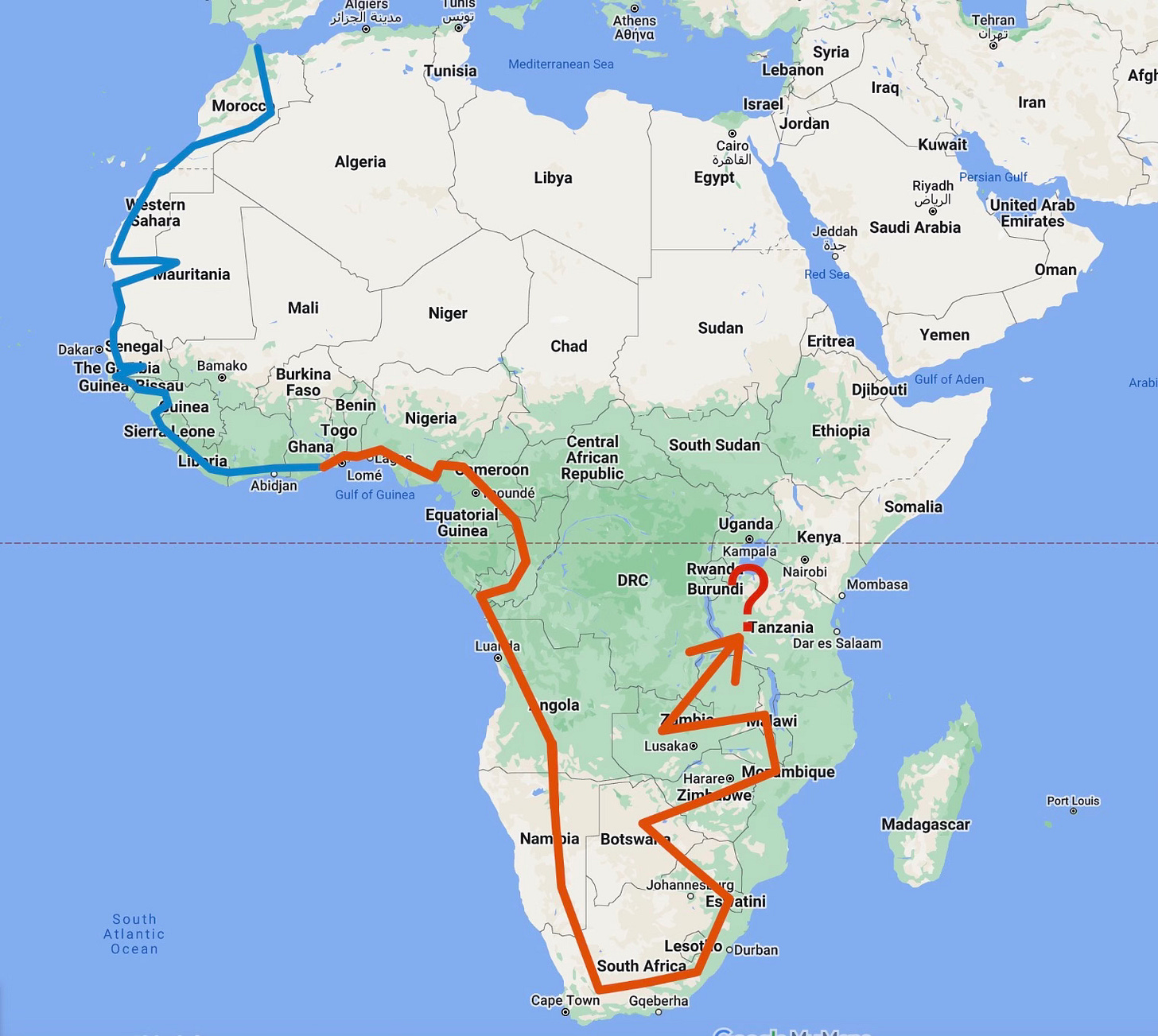 All being well we’re hoping to get to Ghana this May, where we’ll store Ivy for a few months over the worst of the rainy season and return to Europe for a large dose of family/friends/work/apartment/life admin stuff. We’ll then continue roughly by this route below. That scribbled line does cover the countries we’ve visited and plan to visit, but in no way represents a detailed route. I say ‘all being well’ because we never know what life will throw at us, and one certainly can’t be sure of the political or security situation anywhere these days. But this is the plan for now. 🤞🏼
