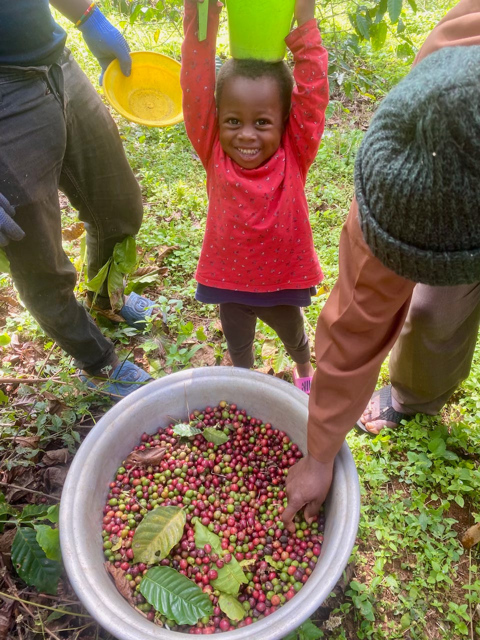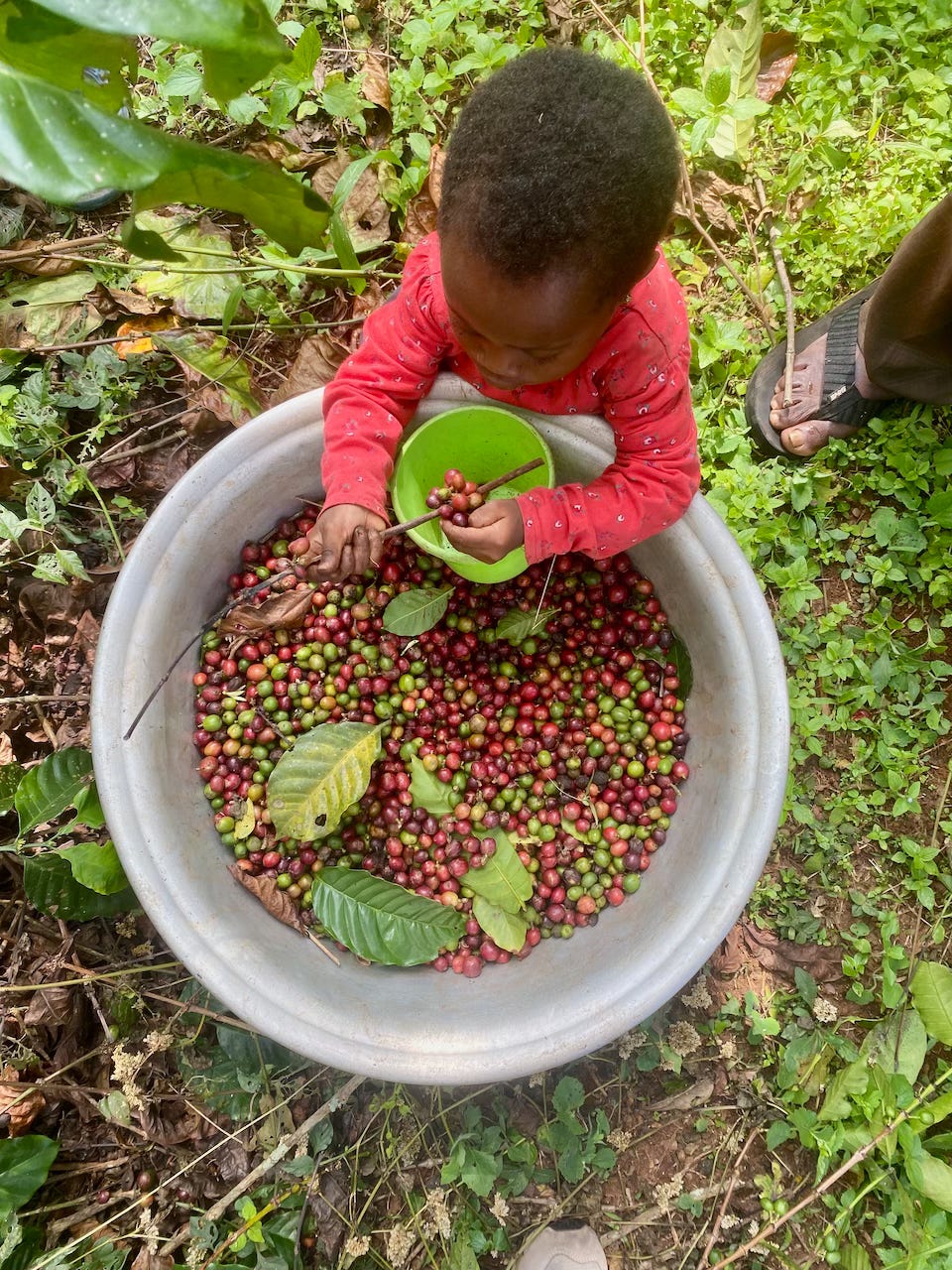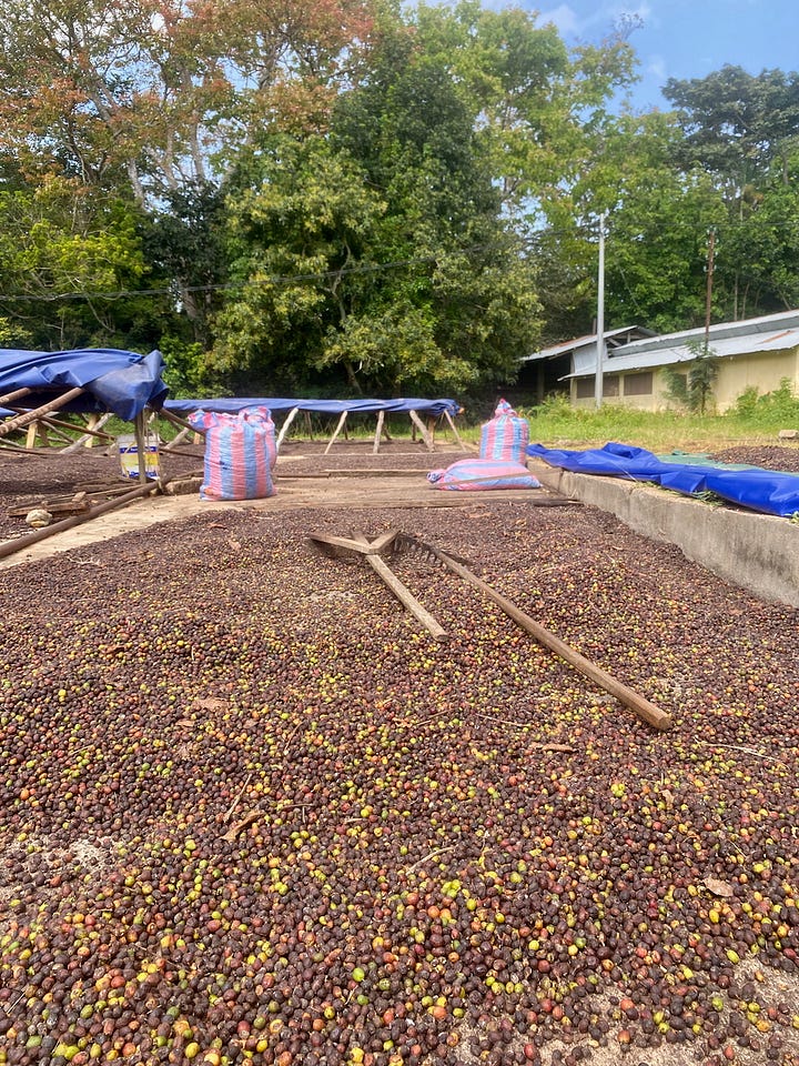 In the morning one of the monks took us on a little tour in their small forest and showed us where they grew and processed the products. Local people come to harvest the coffee beans and earn cash – this little girl was helping her mum and dad and proudly practising how to carry the beans on her head like the grown-ups.