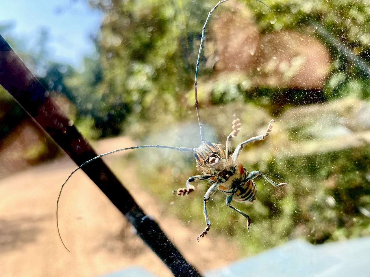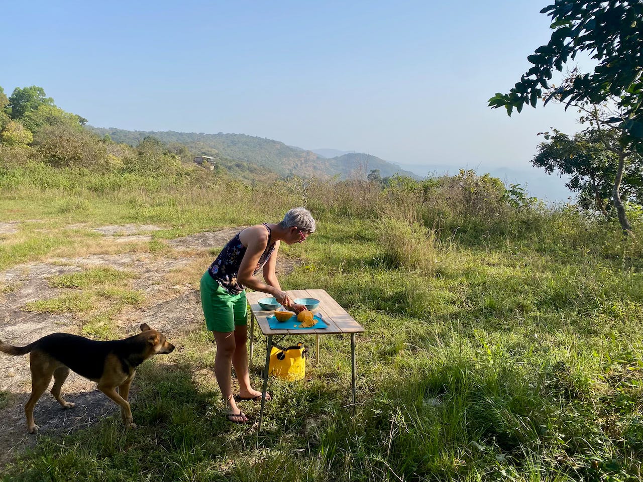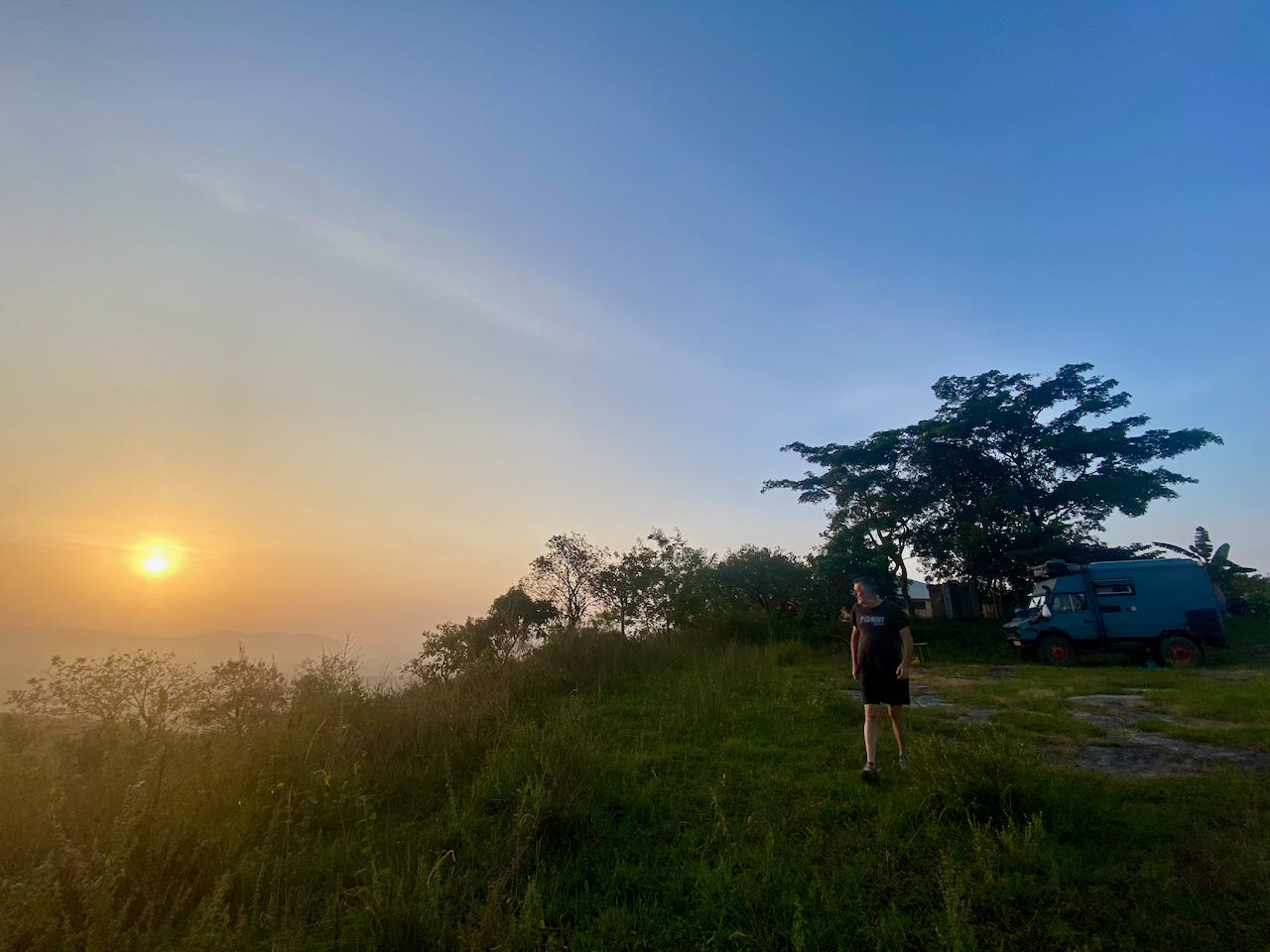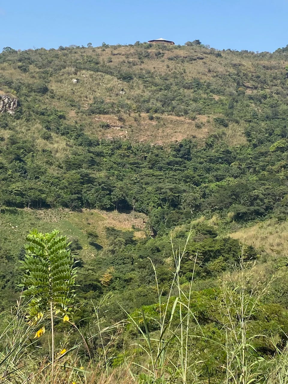 It wasn’t far to the next stop but it took a while over washed-out roads and around switchbacks as we climbed to about 750m. At the top there’s a hotel/events place called Golden Eye which has the view to die for. Like so many of these places we visit, it was practically deserted. Where is everyone? We camped in a huge adjacent space with a panoramic view and enjoyed a sunset beer on their balcony. Good vibes.