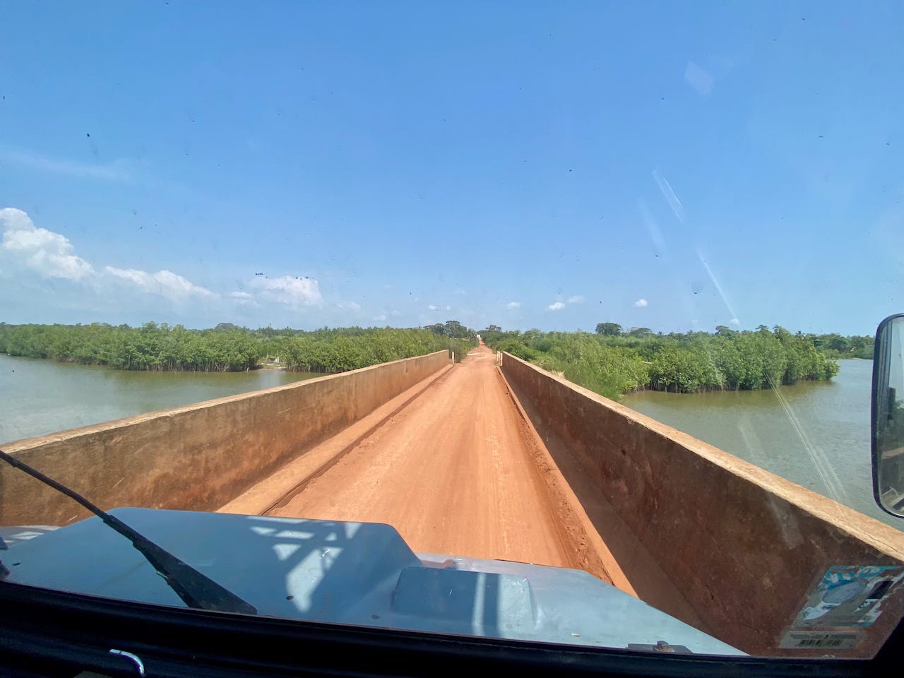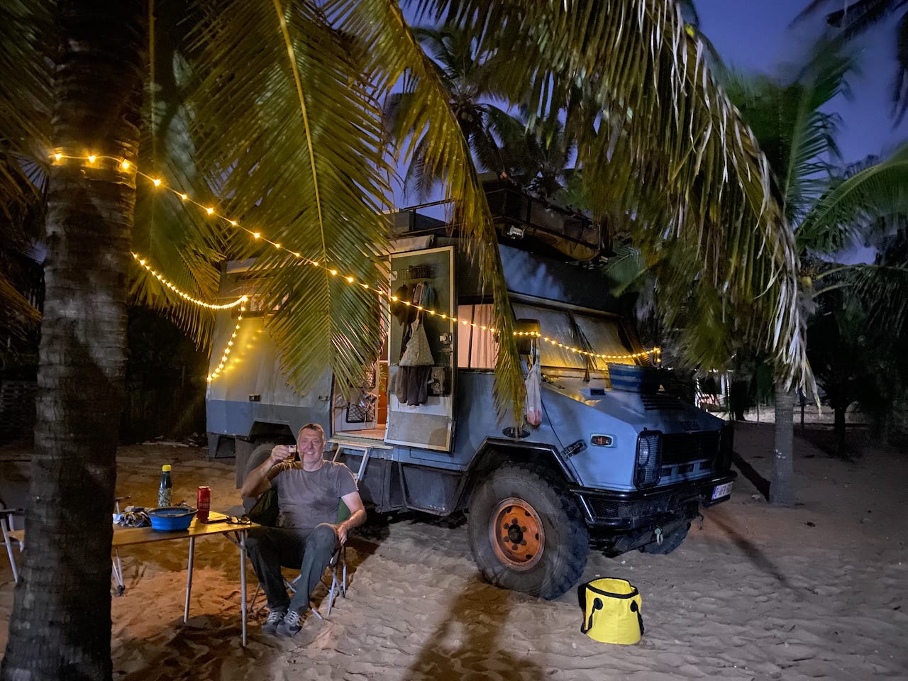 We switched it on and off again a zillion times to make sure it wasn’t just a fever dream, checked the cables again for a loose connection and, well, what else could we do? If it ain’t (currently) broke, you can’t fix it. Amid much head-scratching we headed back towards la Caisse and parked nearby, then Darren later took us to a secure spot elsewhere to leave Ivy for the night. We were keen to join them on their weekly BSL night out at a local spot nicknamed the ‘Blue Bar’– a little backstreet shop with tables outside which reportedly sells enough beer to the expats on a Friday to provide their income for a whole week. A long tradition for BSL staff, it has since evolved to include people from NGOs, UN, embassies and other organisations too. It was a really enjoyable and interesting night, and just our kind of grungy African bar!